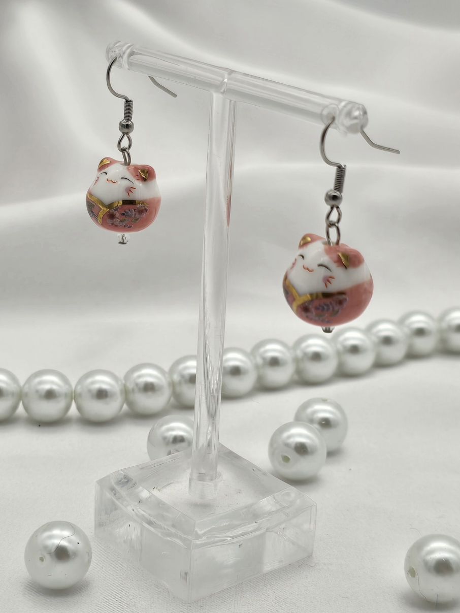 Ohrringe mit kleinen Katzenperlen in rosa und Edelstahlhaken.